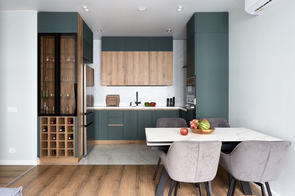 Важно помнить: при любом дизайне остаются базовые стандарты — например, стандарт глубины навесных кухонных шкафов 30–35 см, а стандартная глубина нижних шкафов кухонного гарнитура — 60 см. Но в индивидуальных проектах эти параметры можно корректировать.