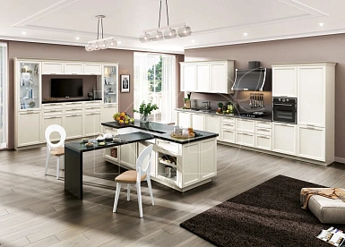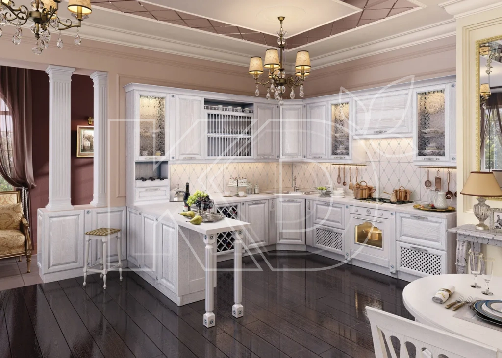 Для производства классических гарнитуров применяются качественные материалы. Фасады выполняют из натуральной древесины бука, ясеня или дуба. Более доступный вариант – качественный МДФ высокой прочности. Для производства столешниц используется натуральный и искусственный камень.