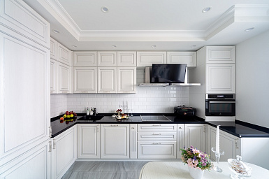 Для отделки фасадов таких кухонь применяется минималистичный декор в виде вставок, филенок, лаконичной резьбы. Геометрические формы сдержанные – прямоугольные или квадратные. Современный модерн предполагает отказ от излишеств и усложненных конструкций.