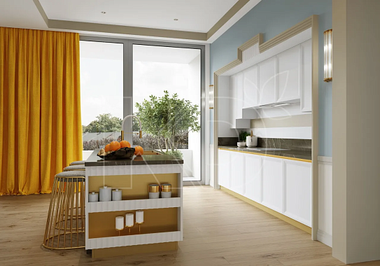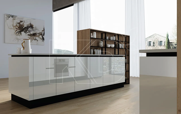 При панорамном остеклении лучше выбрать кухонный гарнитур с высокими вертикальными шкафами, которые следует установить у свободной стены. Рабочую поверхность и мойку можно вынести на островную конструкцию.