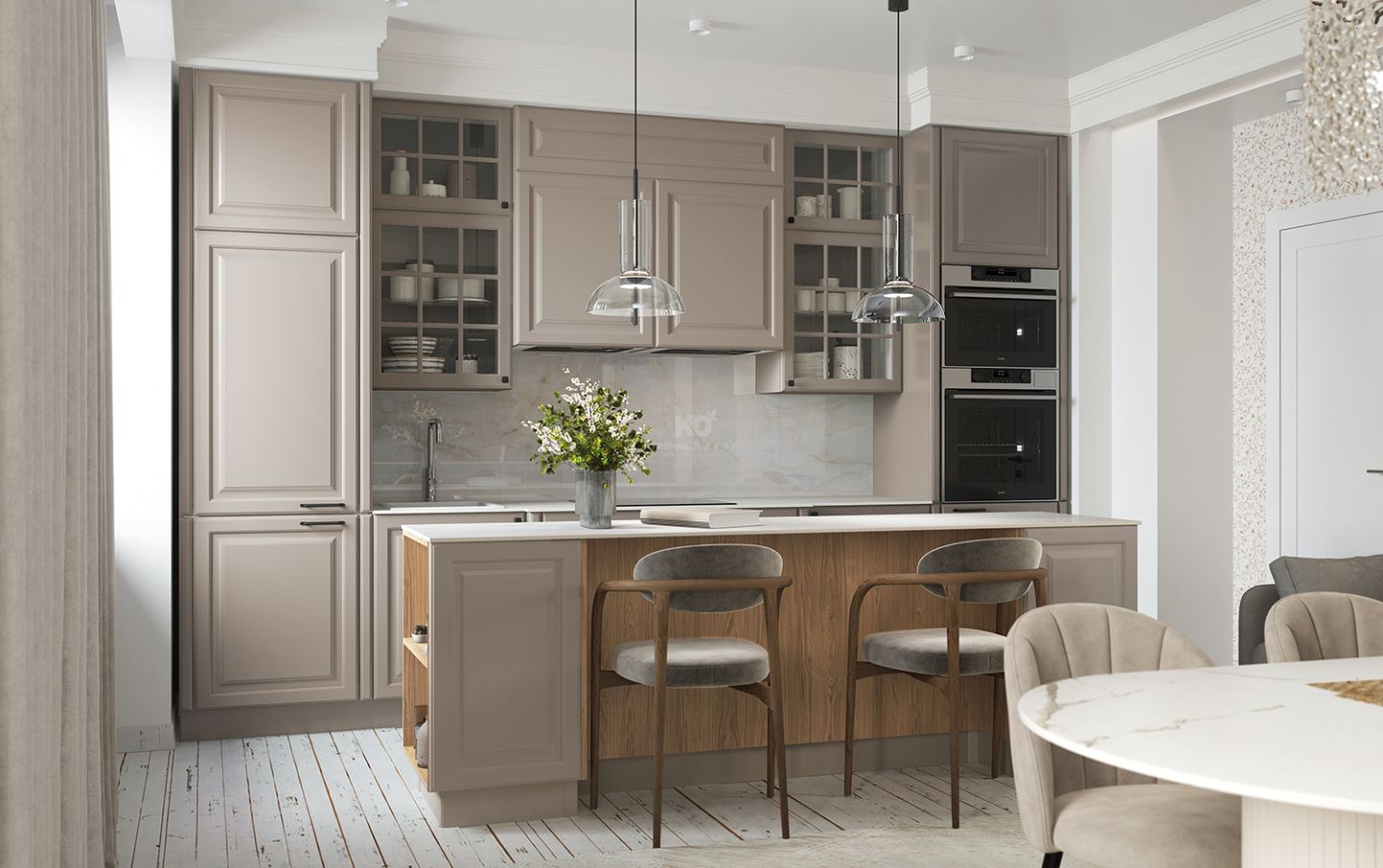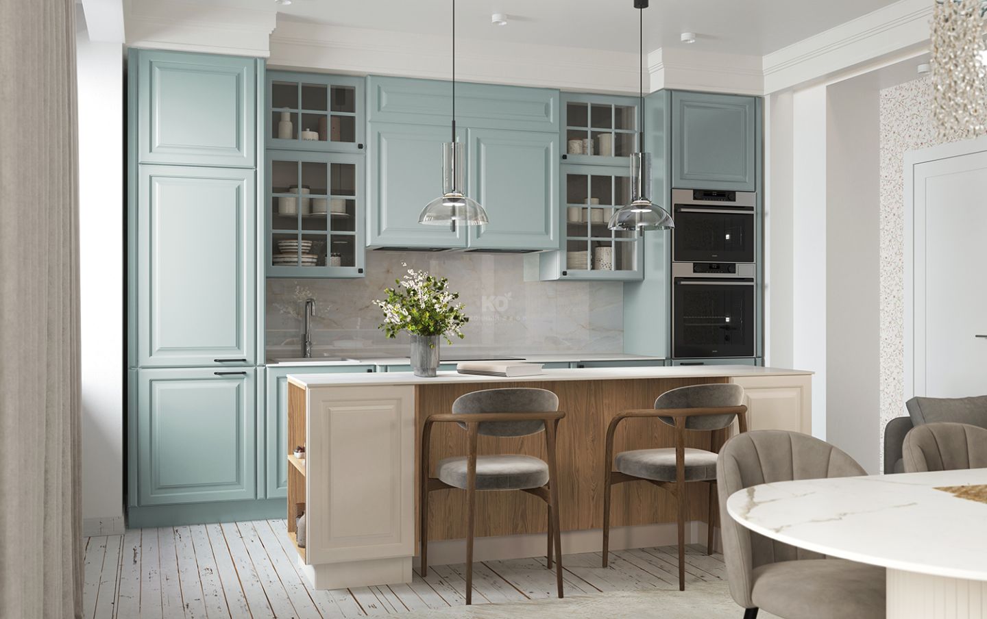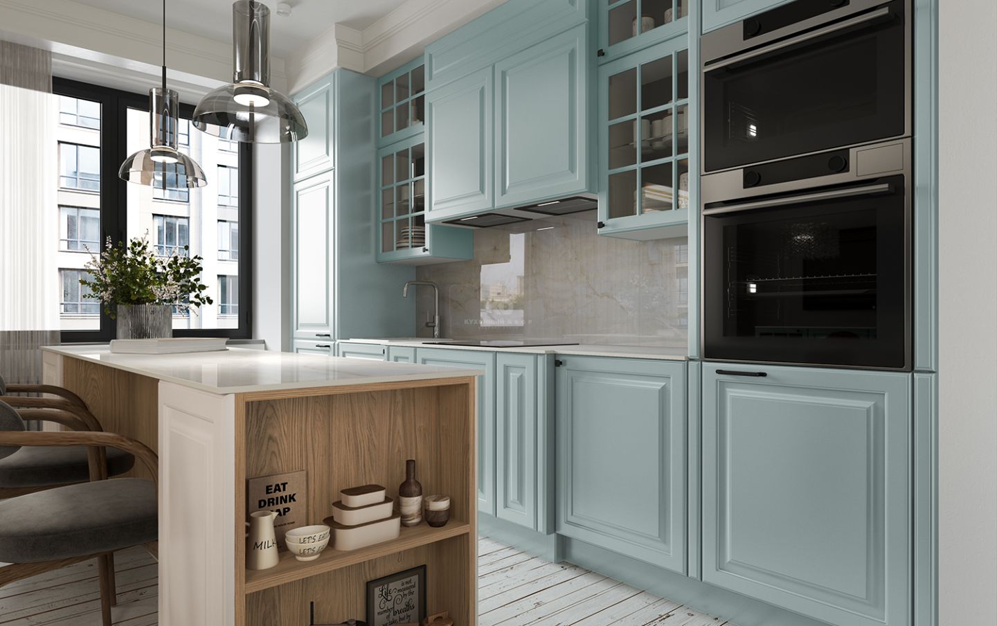 Шкафчики со вставками из стекла напоминают французские окна, характерные для домов исторического центра Парижа эпохи знаменитого градостроителя Османа. Эти прозрачные элементы придают кухне лёгкость, глубину и игру света, создавая ощущение утреннего парижского бульвара, залитого мягким солнечным светом.