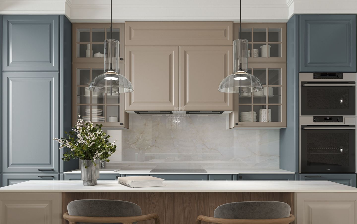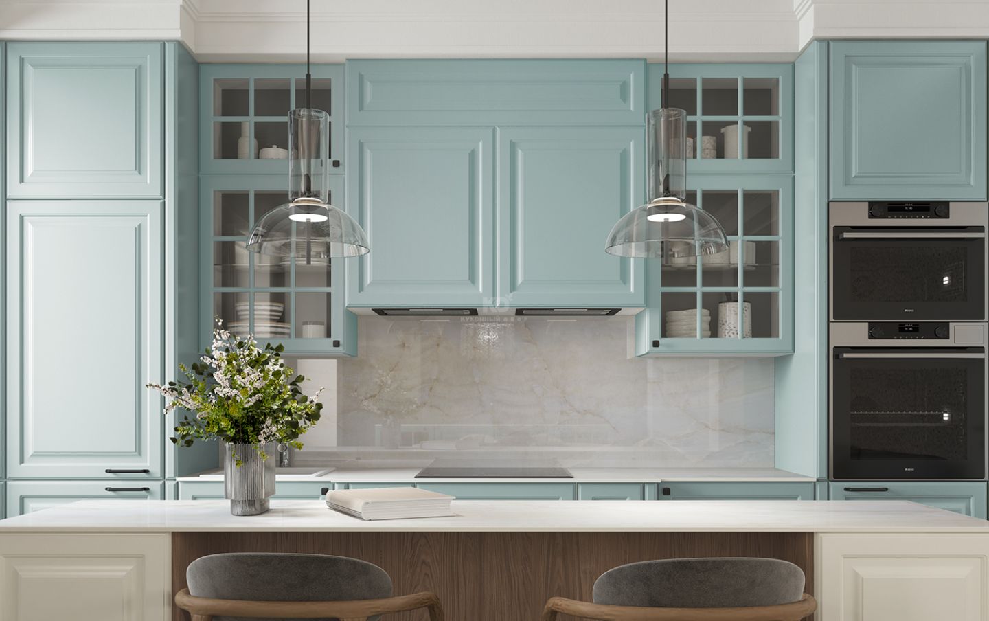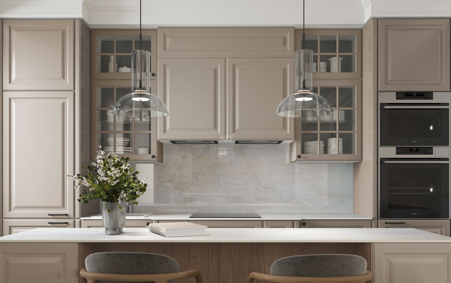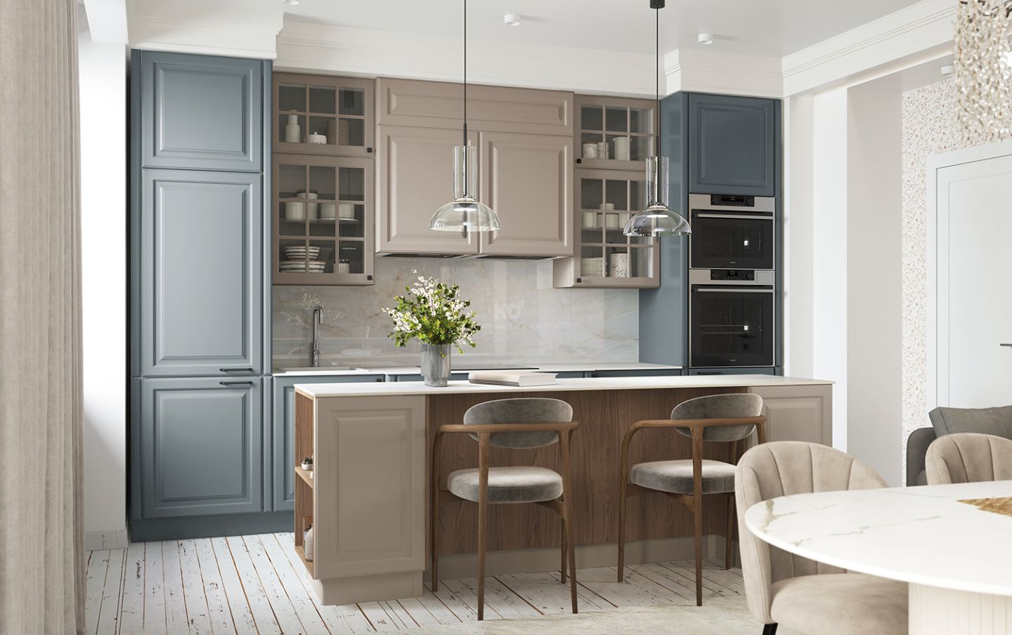 Шкафчики со вставками из стекла напоминают французские окна, характерные для домов исторического центра Парижа эпохи знаменитого градостроителя Османа. Эти прозрачные элементы придают кухне лёгкость, глубину и игру света, создавая ощущение утреннего парижского бульвара, залитого мягким солнечным светом.