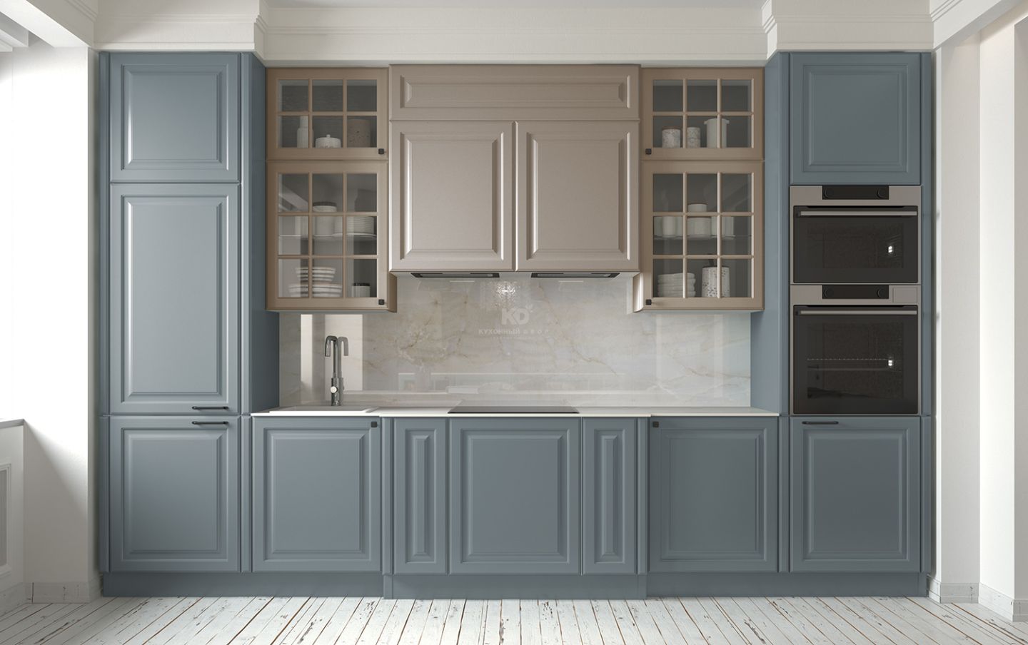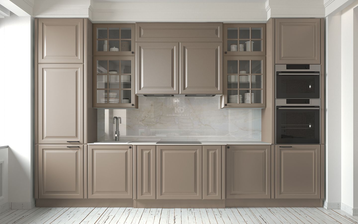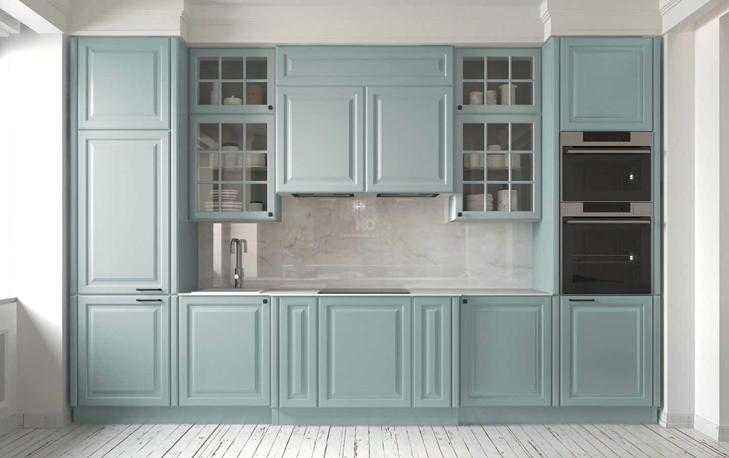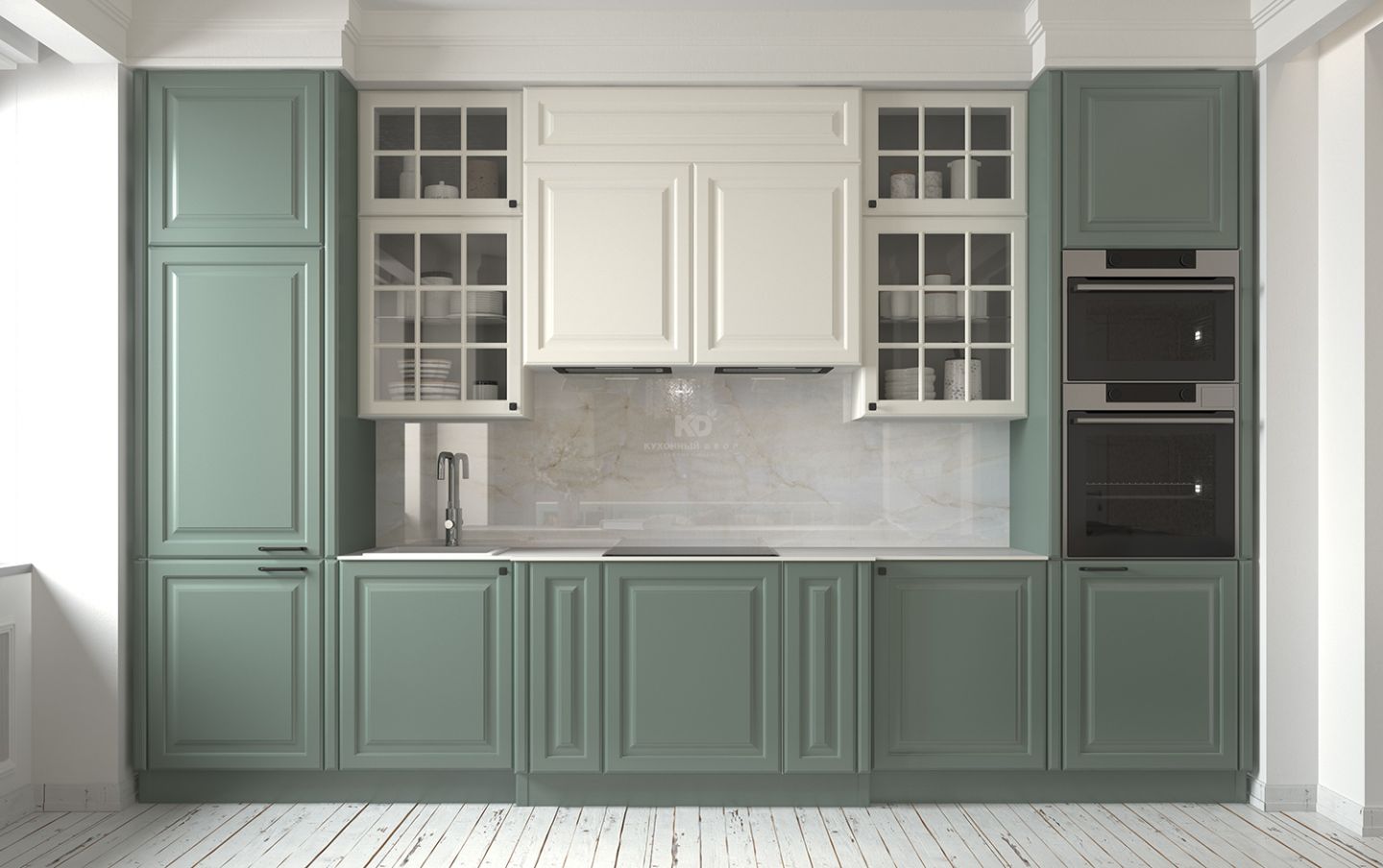 По краям кухня Катарина обрамлена двумя колоннами оттенка полыни — мягкого, спокойного цвета, который подчёркивает её статус и гармонию. Слева — встроенный холодильник, справа — интегрированный духовой шкаф и СВЧ-печь. Такое расположение помогает сохранить симметрию, а также обеспечивает эргономичность и удобство использования.