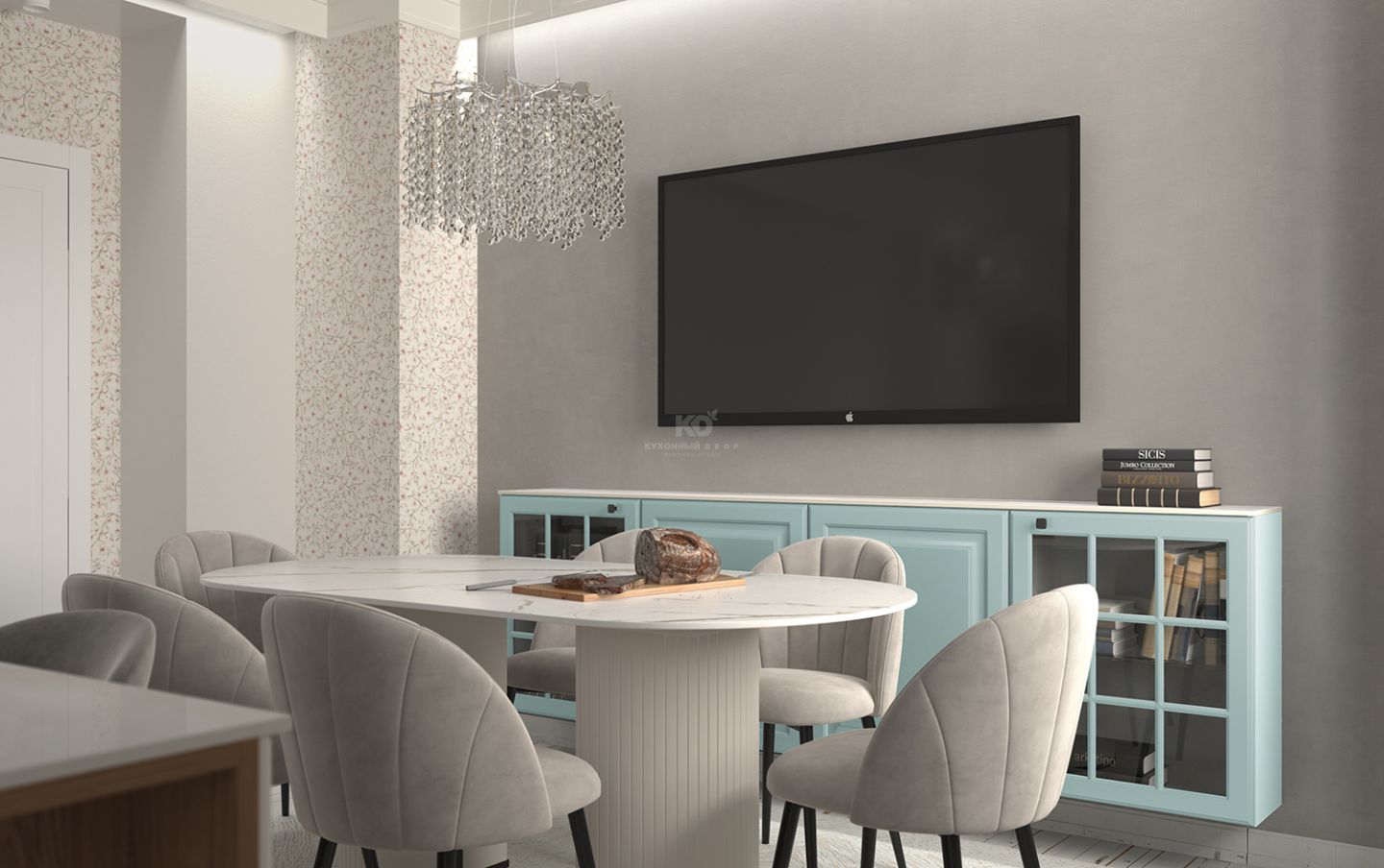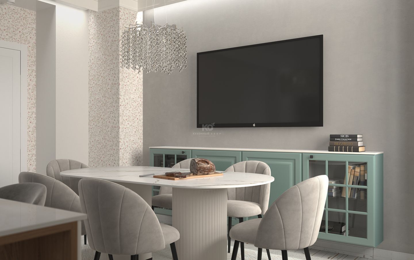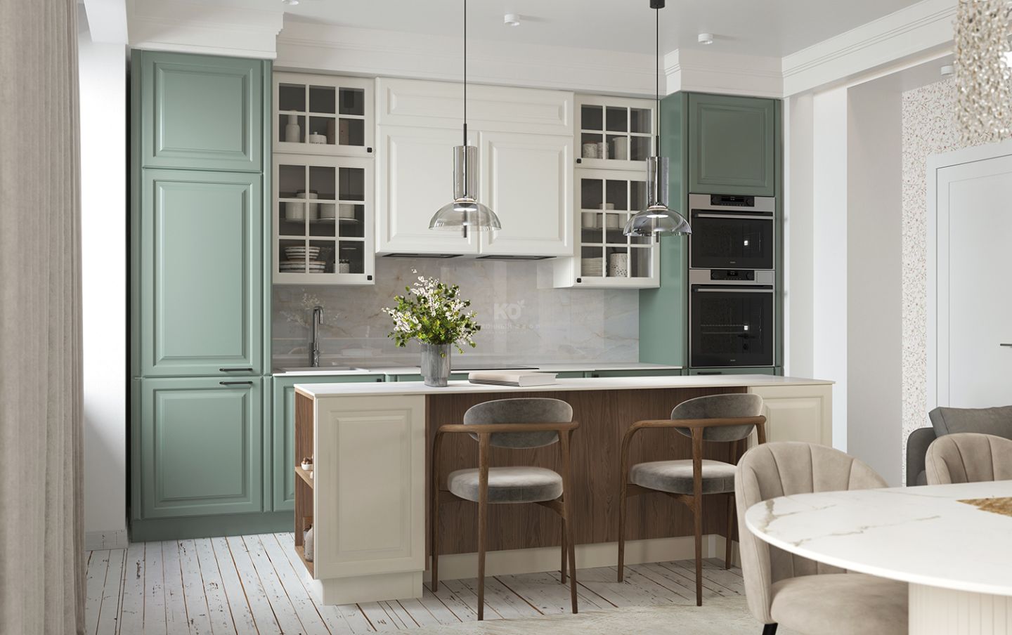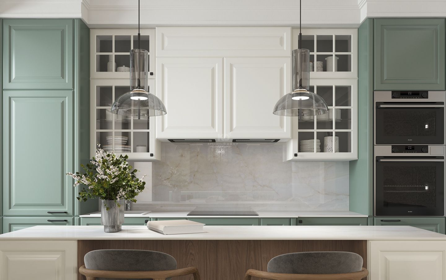 По краям кухня Катарина обрамлена двумя колоннами оттенка полыни — мягкого, спокойного цвета, который подчёркивает её статус и гармонию. Слева — встроенный холодильник, справа — интегрированный духовой шкаф и СВЧ-печь. Такое расположение помогает сохранить симметрию, а также обеспечивает эргономичность и удобство использования.
