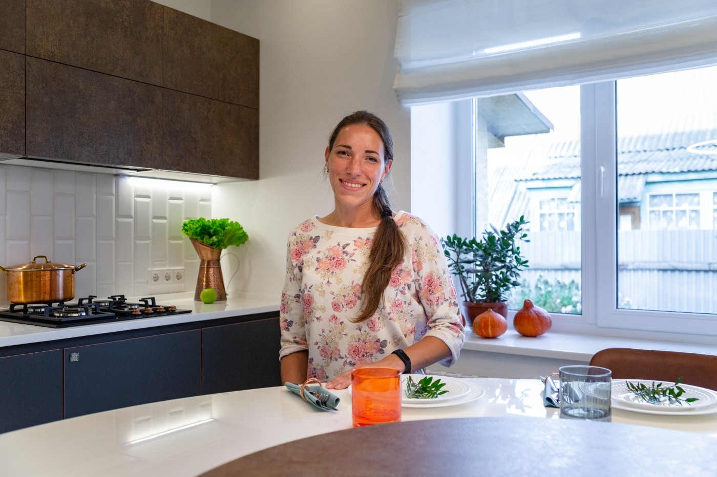 Тёмные фасады выглядят особенно прекрасно в симбиозе со столешницей из белоснежного акрилового камня. А на самой столешнице в свою очередь выделяются тёмная каменная мойка и варочная панель из чёрного закалённого стекла. Образуется многоступенчатая игра контрастов, которая делает «Ханну Стил» еще более необычной.