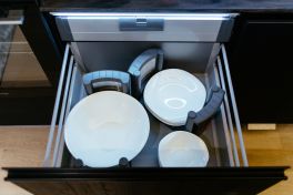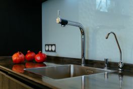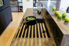 Декоративные элементы: интегрированная ручка, покрашенная под цвет фасада, оригинальные фасады со стеклом без рамки.