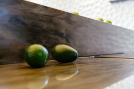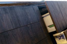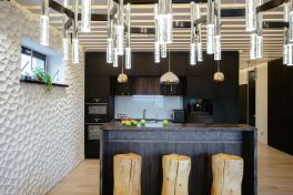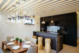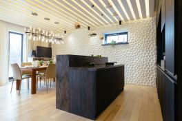 Материал и цвет фасадов: плиты TSS, отличительной особенностью которых является ярко выраженная структура поверхности, имитирующая наличие глубоких пор, естественного спила дерева, ручной обработки древесины. В проекте использовались два цвета панелей TSS – чёрный и тёмно-коричневый с золотистым свечением.